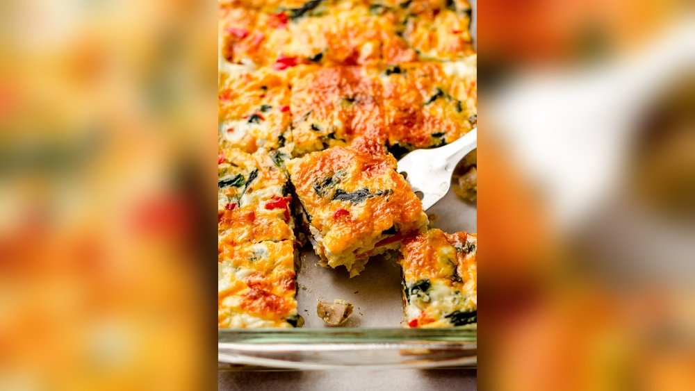 • Stir in spinach, bell peppers, ham/bacon, and cheese.